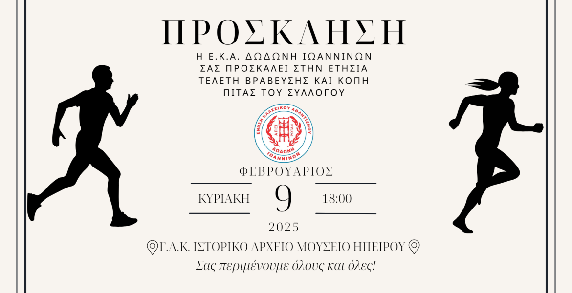 Η Ε.Κ.Α. Δωδώνη Ιωαννίνων προετοιμάζεται για μια ξεχωριστή βραδιά, καθώς την 9η Φεβρουαρίου και ώρα 18:00, θα πραγματοποιηθεί η ετήσια τελετή βράβευσης και κοπή της πρωτοχρονιάτικης πίτας. Η εκδήλωση θα φιλοξενηθεί στον μοναδικό χώρο του Ιστορικού Αρχείου – Μουσείου Ηπείρου (Σουφαρί Σεράι), όπου αθλητές, μέλη, γονείς και φίλοι του συλλόγου θα συγκεντρωθούν για να γιορτάσουν τις επιτυχίες της περασμένης χρονιάς.